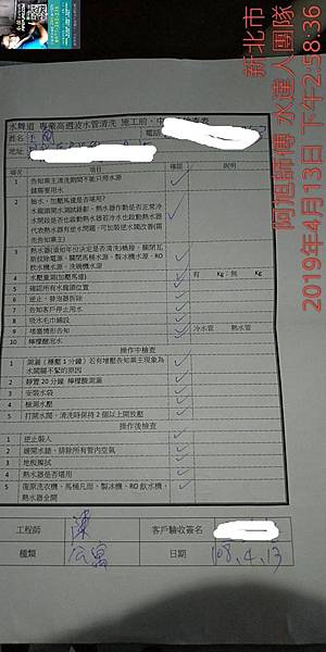 總共會做三次的測漏,沒問題才會開始打週波清洗,配合檢查表一一做確認。最後清洗完水管,再做一次測漏。最後也會交給客戶一份作為依據。