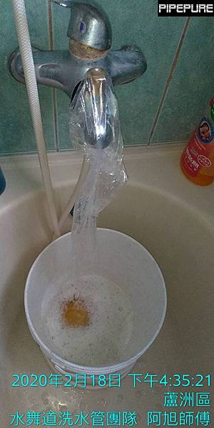 清洗水管 原因:自來水有黃水流出。清洗水管前先了解「流黃水」的源頭,熱水管有黃水,冷水管沒有,心中大石降一半,如果冷水管流黃水,坦白講,只有50%的機率可以改善,改善機率超低的..繼續查熱水管「流黃水」源頭,還好不是所有的熱水都「流黃水」,只有一間衛浴熱水管鏽蝕較嚴重,我們針對這段熱水管週波時間加倍,酵素也加倍(快速軟化水垢,對鐵屑沒轍)將鐵屑盡量排出來(鏽塊較深層較硬較久的不可能),清洗完水管後總算有改善成功!