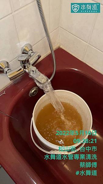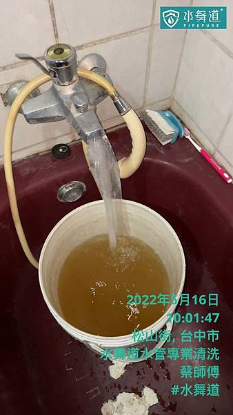 我們清洗前先做出水量測試,水管材質相當不錯,全屋出水量都正常,不過熱水管老化生鏽,脈衝清洗出相當多鐵屑,建議每年定期清洗水管,改善用水衛生。