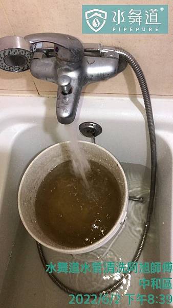 清洗前詢問屋主得知,水有顏色的問題出現在熱水部分,這顏色是呈現褐色(鏽水),表示熱水管嚴重生鏽,水因長時間不流動,鏽水顏色就容易出現,如果經常使用,水較不易出現顏色;脈衝清洗過程中,熱水管清洗出深褐色鏽水,建議屋主定期清洗水管,改善用水衛生,別拖太久才清洗,改善程度相對有限。