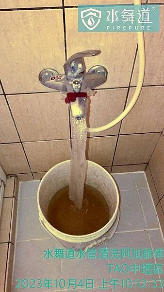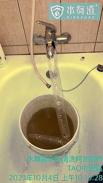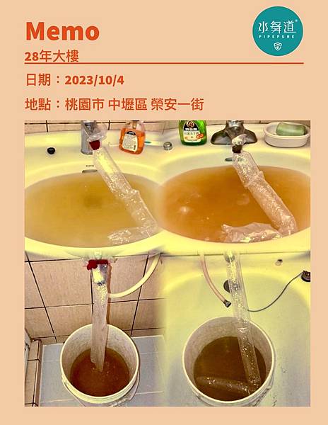 狀況:熱水管老化生鏽,末端清洗出咖啡色鏽水,鐵屑非常多,所幸全屋出水量都沒有問題,建議業主,每年定期清洗水管,來延緩水管壽命。