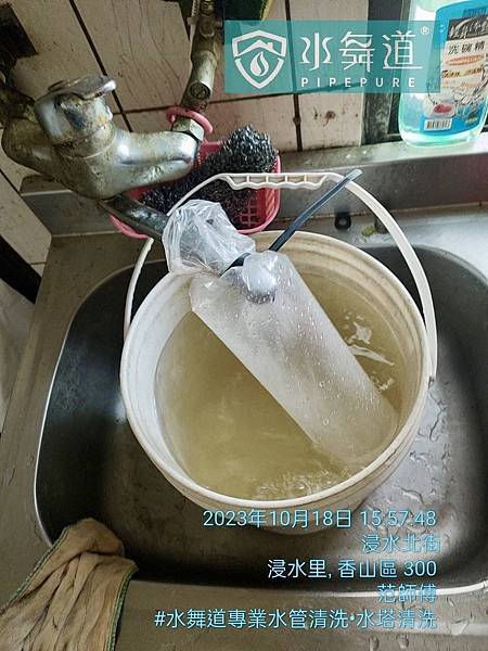 附帶一提,洗這種地下水千萬不能加檸檬酸,加下去之後產生化學變化,七天七夜水出來都會是黑色的,很多DIY洗水管加檸檬酸進去,來找我們處理都會洗很久,運氣好的可能當天改善,但有些依然是黑水,不過不影響用水,平常水流出來是透明的,透明不代表乾淨,只是與檸檬酸產生化學變化而已。