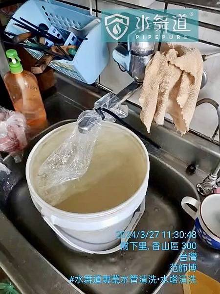 P.S.清洗水管過程全程攝影錄影,屋主必須全程陪同,確保施工品質,我們也按照程序、步驟、要領施作,清到變成水透明無色才會換下一個水龍頭。